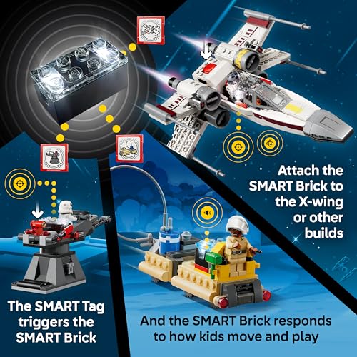POWER UP THE X-WING – Place the SMART Brick in the X-wing for motion-activated engine sounds and lights, laser-shooting noises, plus refueling and repair sounds