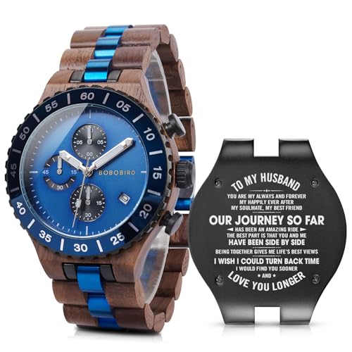 2win Engraved Wooden Watches for Men Blue Date Chronograph Military Luxury Personalized Customized Wrist Watches Anniversary Watch Gift for Husband My Man Boyfriend