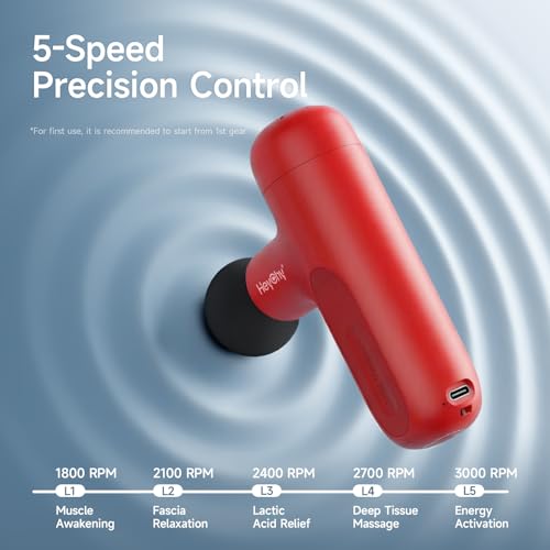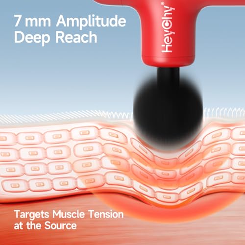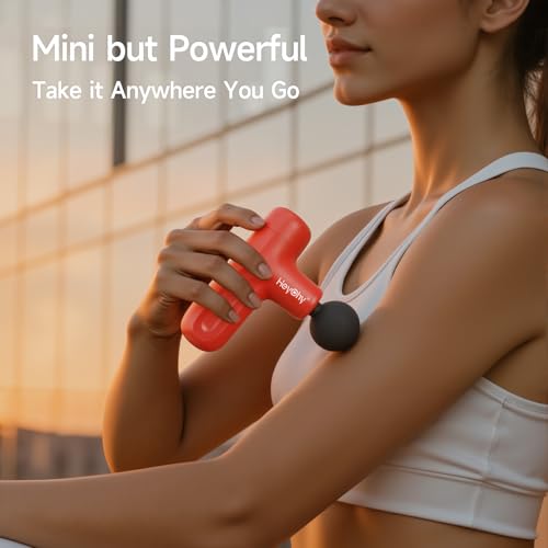 Specification: HEYCHY Super Mini Massage Gun Deep Tissue, Handheld Percussion Massager with 4 Heads, Travel Size Muscle Massager Gun for Men & Women Back Pain Relief, Quiet for Home, Gym, Office, Red