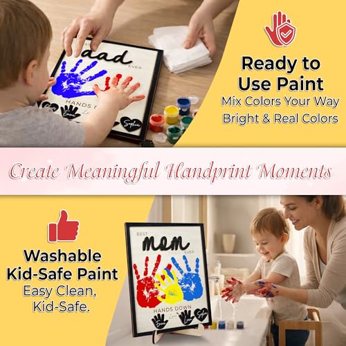 Complete DIY Handprint Kit: package includes a 10”x8” wooden frame; acylic paint (non-toxic) & brush set; 2 heart icons & 2 hand icons & Pen for writing each family member’s name; double-sided sticky dots, 1 Keychain Gift, 1 wooden stand & 1 hanger hook, 1 Gift box