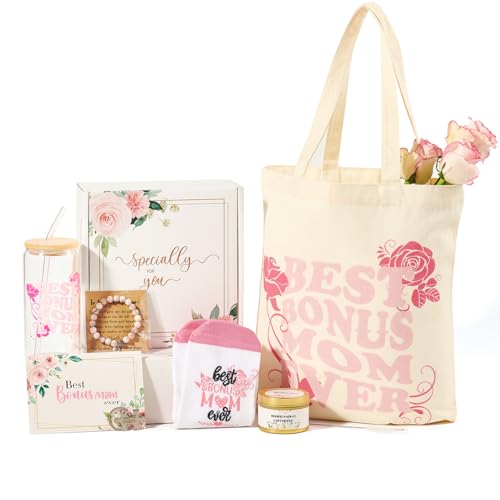 Pink Rose Bonus Mom Gift Set: Celebrate Your Special Bond : This elegant gift set embraces the warmth of the pink rose theme, perfect for celebrating your Bonus Mom’s birthday, Christmas, or any special occasion. Includes a 16oz glass cup, tote bag, cozy socks, greeting card, candle, stone bracelet, puzzle keychain, and gift box. An ideal way to show your love and appreciation