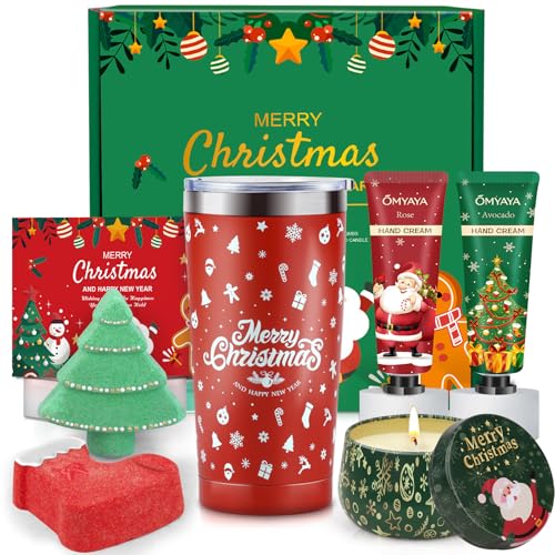 🥳【Relaxing Spa Gift for Women】The bath gifts for women contains 1 pack 20-ounce stainless steel Christmas insulated tumbler, 2 packs hand creams with different scents – avocado, rose scent; 1 pack fig scented candles; 1 pack Christmas Tree bath bomb; 1 pack Christmas stocking bath bomb and 1 pcs greeting card. The bath gift set is perfect for women to use during a home spa bath or skin care session to relax and unwind.