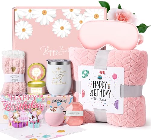 Premium Happy Birthday Box For Women: Wasocol Birthday Gifts for Sister,Mom, Wife,Best Friend, Make her birthday unforgettable with this thoughtfully curated gift set! it includes a luxury blanket, a 12oz insulated tumbler, a natural rose scented candle, rose bath bomb, handmade soap, silk eye mask, fuzzy socks, a 3D birthday card, and a beautiful birthday gift box. Every Birthday Box is handpicked to bring warmth, comfort, and joy—making it the ideal birthday gift to show her how much you care.