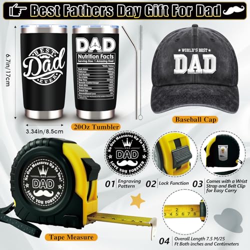 A Complete 11-Piece Father’s Day, Christmas Gift Set For Dad: Curated for Father’s Day, Christmas, birthdays and “just because,” this box includes: 20 Oz Tumbler with Lid/Straw, Embroidered Baseball Cap, 25 Ft/7.5 M Tape Measure, “Best Dad Ever” Socks, Beaded Bracelet with Card, Metal Keychain, Wallet Card, Multifunction Pen, Bottle Opener, Greeting Card, and a Premium Gift Box; thoughtful dad gifts for men, stepdad/bonus dad, father-in-law or husband from wife, son or daughter
