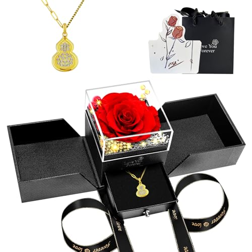 Birthday Gift for Women, Preserved Red Real Rose Jewelry Box with LED,forever roses I Love You Lucky Gourd Necklace Romantic Gift for Her Mom Wife Girlfriend on Birthday Anniversary Valentine