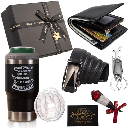 ✅【 Gift Set for Men 6 Piece】✅Our mens birthday gifts set has 6 unique gifts for men, contains the following items:1*14oz 4in1 Beer Can Cooler and coffee travel mug, 1*49.2″ men’s belt (with hole punch), 1*4″ x 3.5″ men’s wallet, 1*wish greeting card, 1* rose for blessing, beautiful gift box size is 8.7*7.4*4in.Surprise him with our men birthday gift ideas and give him a happy birthday gift.