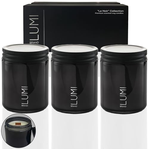 Set of 3 Premium Scented Soy Candles Gift Set | Le Noir Collection – Men’s Cologne, Red Teakwood, Bergamot & Oud | Crackling Wood Wick | Luxury Candles for Relaxation, Home Décor & Gifts | 9.8oz Each