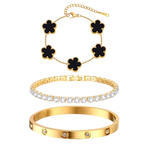 Womens Stackable Floral Gold Bracelets – 3Pcs 18K Gold Plated Bracelet,Stainless Steel Bangle Bracelets Non Tarnish, Gold Bracelet Set Trendy Jewelry,Christmas Valentines Birthday Gifts for Girlfriend