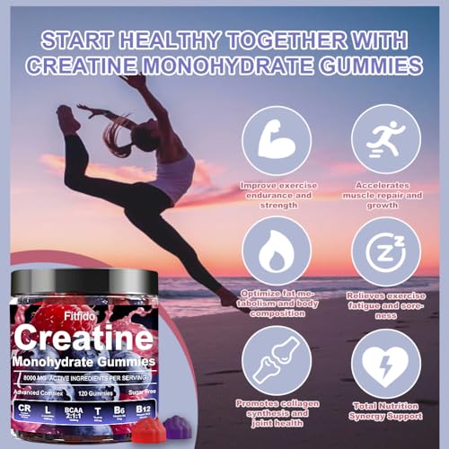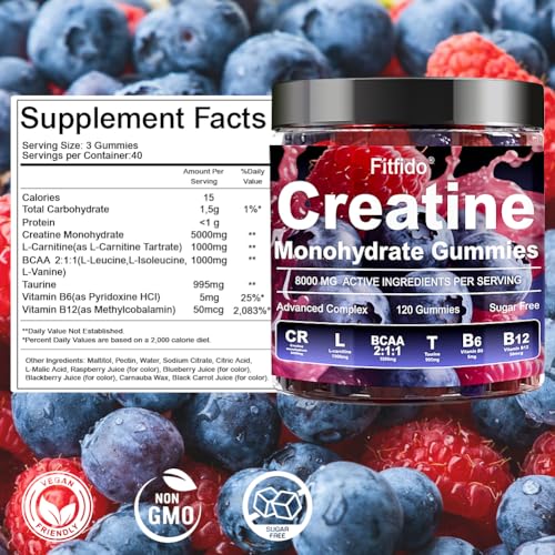 Specification: Creatine Monohydrate Gummies Complex 8000mg for Men and Women, Containing L-carnitine & Taurine, Build Muscle, Boost Energy, Faster Recovery, Sugar Free & Vegan, Raspberry & Blackberry, 120 Count