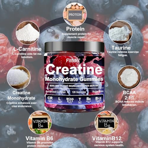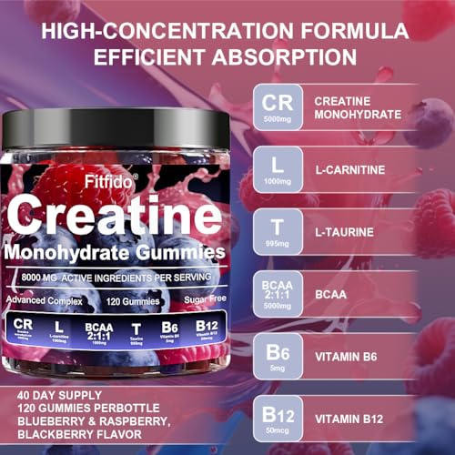 Creatine Monohydrate Gummies Complex 8000mg for Men and Women, Containing L-carnitine & Taurine, Build Muscle, Boost Energy, Faster Recovery, Sugar Free & Vegan, Raspberry & Blackberry, 120 Count